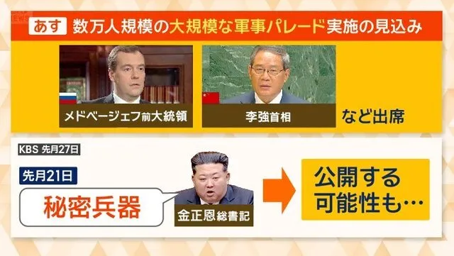 Vậy, những gì đã được trưng bày? Tên lửa đạn đạo liên lục địa (ICBM) "Hwasong-19" có thể bắn tới lục địa Hoa Kỳ, tên lửa hành trình siêu thanh, nhiều loại máy bay không người lái, và như một phần của triển lãm, Tổng Bí thư Kim đã thị sát tàu khu trục mới "Chaehyon-ho" trọng tải 5000 tấn. Hơn nữa, một cuộc duyệt binh quy mô lớn với hàng chục nghìn người dự kiến sẽ được tổ chức vào ngày 10 (có thể sớm nhất là tối ngày 9), và các loại vũ khí được trưng bày trong triển lãm cũng được cho là sẽ xuất hiện. Cựu Tổng thống Nga Dmitry Medvedev và Thủ tướng Trung Quốc Lý Cường sẽ tham dự. Theo KBS, có khả năng vũ khí bí mật mà Tổng Bí thư Kim Jong Un đã đề cập sẽ được công bố.