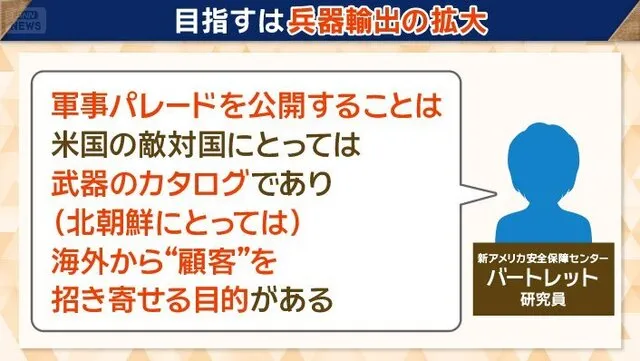 Mục tiêu của Bắc Triều Tiên là mở rộng xuất khẩu vũ khí. Nhà nghiên cứu Bartlett của Trung tâm An ninh Mới của Mỹ (CNAS) đã từng phân tích rằng "việc công khai các cuộc duyệt binh là một danh mục vũ khí cho các đối thủ của Hoa Kỳ, và đối với Bắc Triều Tiên, nó có mục đích thu hút khách hàng từ nước ngoài".