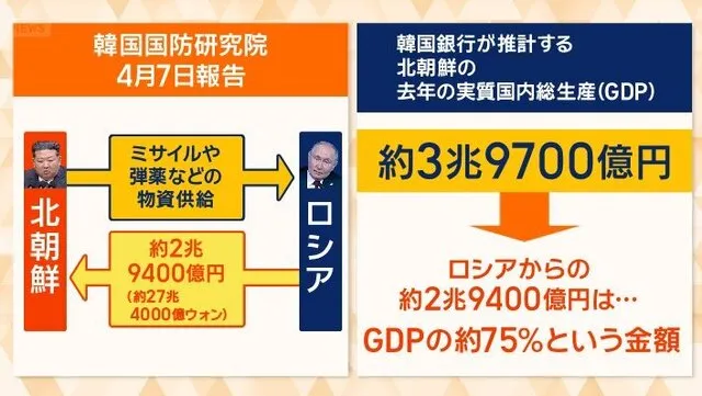 Thực tế, theo Viện Nghiên cứu Quốc phòng Hàn Quốc, Bắc Triều Tiên đã thu về khoảng 2,94 nghìn tỷ won (khoảng 2,1 tỷ USD) chỉ từ việc cung cấp tên lửa và đạn dược cho Nga. Ngân hàng Trung ương Hàn Quốc ước tính GDP của Bắc Triều Tiên vào năm ngoái là khoảng 3,97 nghìn tỷ won, vì vậy khoảng 2,94 nghìn tỷ won từ Nga tương đương với khoảng 75% GDP.