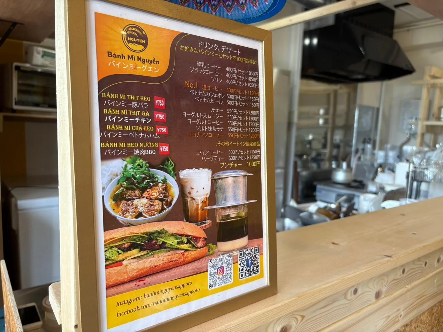 Thực đơn bao gồm bánh mì thịt ba chỉ, gà, giò chả Việt Nam, thịt nướng BBQ và nhiều loại khác. Đồ uống có cà phê sữa đá, cà phê sữa Việt Nam và bia Việt Nam. Nếu mua kèm bánh mì, bạn sẽ được giảm giá 100 yên, nên rất đáng để thử.