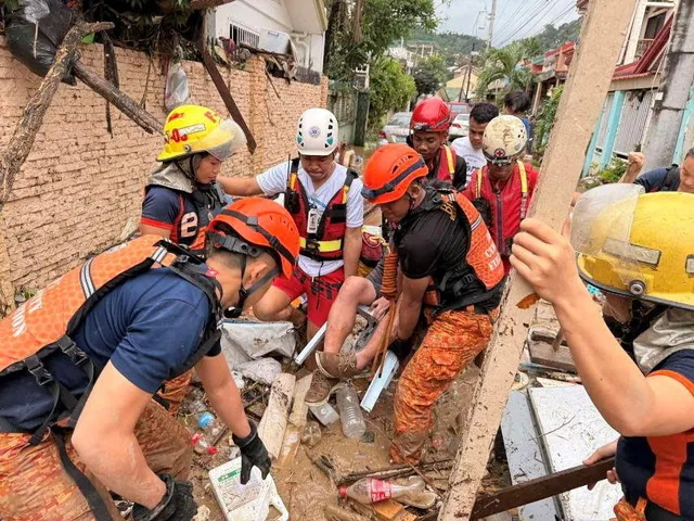 Theo nhà chức trách Philippines, số người thiệt mạng do bão số 25 (Kalmaegi) đổ bộ vào miền Trung nước này đã lên tới 46 người vào ngày 4 tháng 11. Ảnh: Nhân viên Hội Chữ thập đỏ Philippines đang hỗ trợ cứu hộ người dân. Chụp tại Talamban, thành phố Cebu cùng ngày (2025, Reuters/Philippine Red Cross)