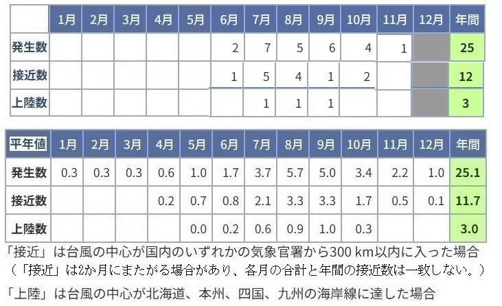 Thêm vào đó, bão số 5 đổ bộ Hokkaido vào tháng 7, bão số 12 đổ bộ tỉnh Kagoshima vào tháng 8, và bão số 15 đổ bộ tỉnh Kochi vào tháng 9, đã đạt mức trung bình 3 cơn bão đổ bộ hàng năm.