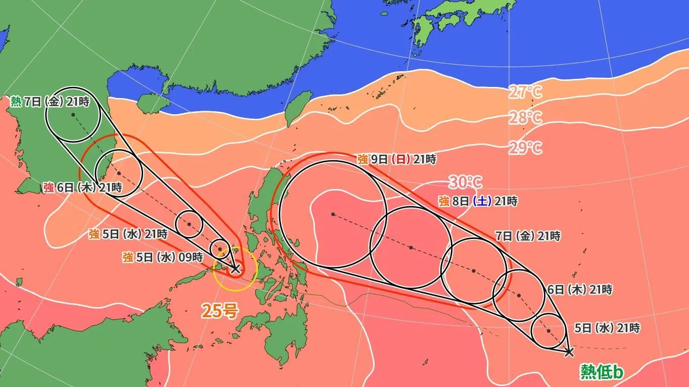 Bão mạnh số 25 đang di chuyển về phía Việt Nam và dự kiến sẽ mạnh lên thành cường độ rất mạnh. Ngoài ra, một áp thấp nhiệt đới ở phía Đông của bão số 25 cũng dự kiến sẽ phát triển thành bão, và cũng được dự báo sẽ đạt cường độ rất mạnh. Cả hai cơn bão đều được dự đoán sẽ di chuyển theo hướng Tây về phía đại lục. Dự báo có thể thay đổi. Hãy chú ý theo dõi thông tin mới nhất.