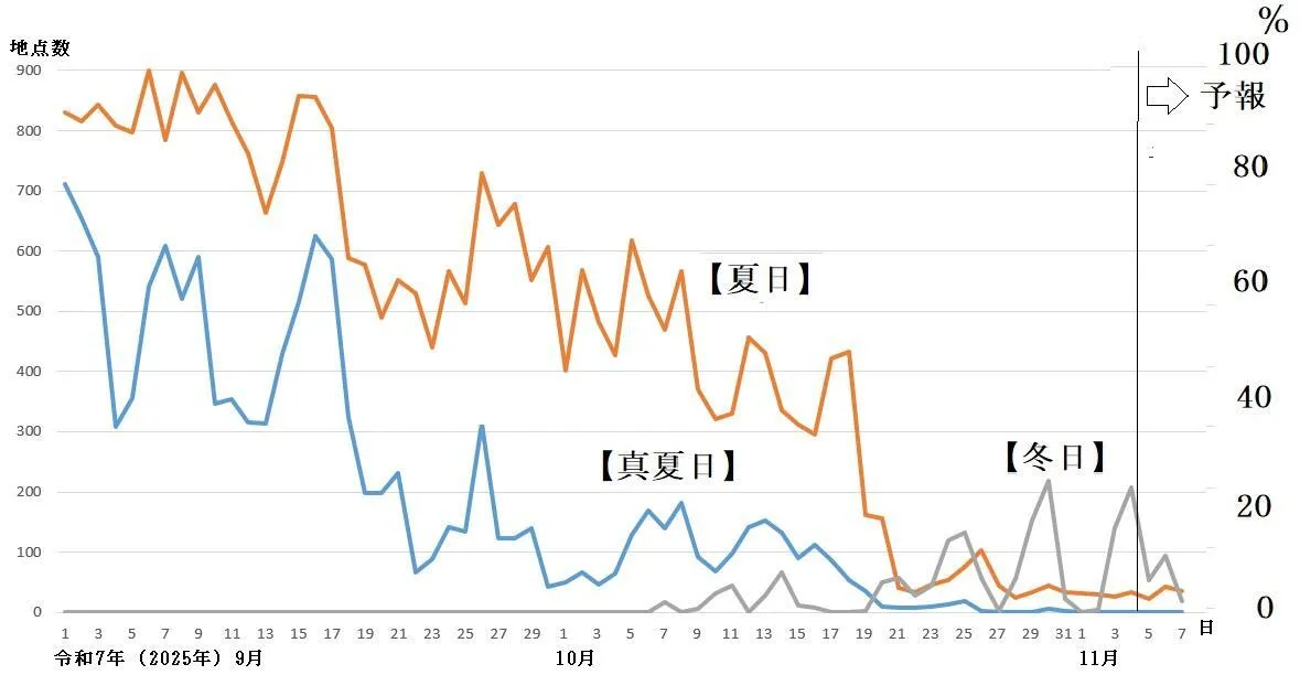 Ngày nóng gay gắt cuối cùng (ngày có nhiệt độ tối cao trên 35 độ C) của năm 2025 là ngày 12 tháng 10, và ngày hè nóng bức cuối cùng có lẽ là ngày 31 tháng 10, cho thấy mùa đông đang đến gần.