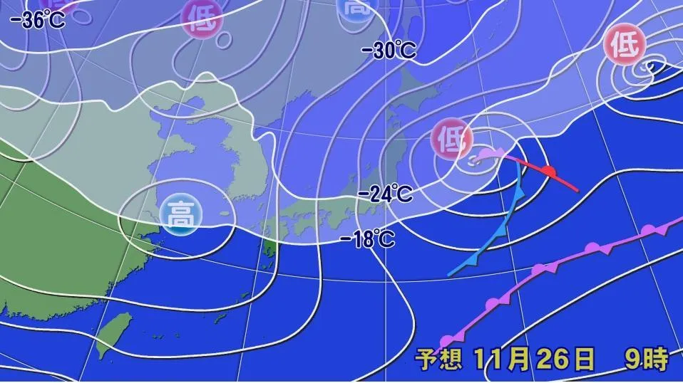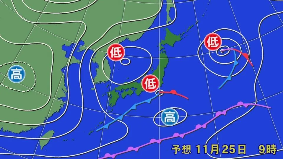 Kỳ nghỉ lễ ba ngày bao gồm Ngày Lễ Tạ Ơn vừa qua có nhiều nơi trời nắng do khối khí áp cao di động đi qua. Tuy nhiên, vào ngày 25, sau kỳ nghỉ, một vùng áp thấp mang theo không khí lạnh trên cao được dự báo sẽ di chuyển về phía đông trên Biển Nhật Bản, và một vùng áp thấp khác hình thành ở bờ biển phía nam Nhật Bản sẽ di chuyển lên phía bắc trên vùng biển phía đông Nhật Bản (Hình 1).