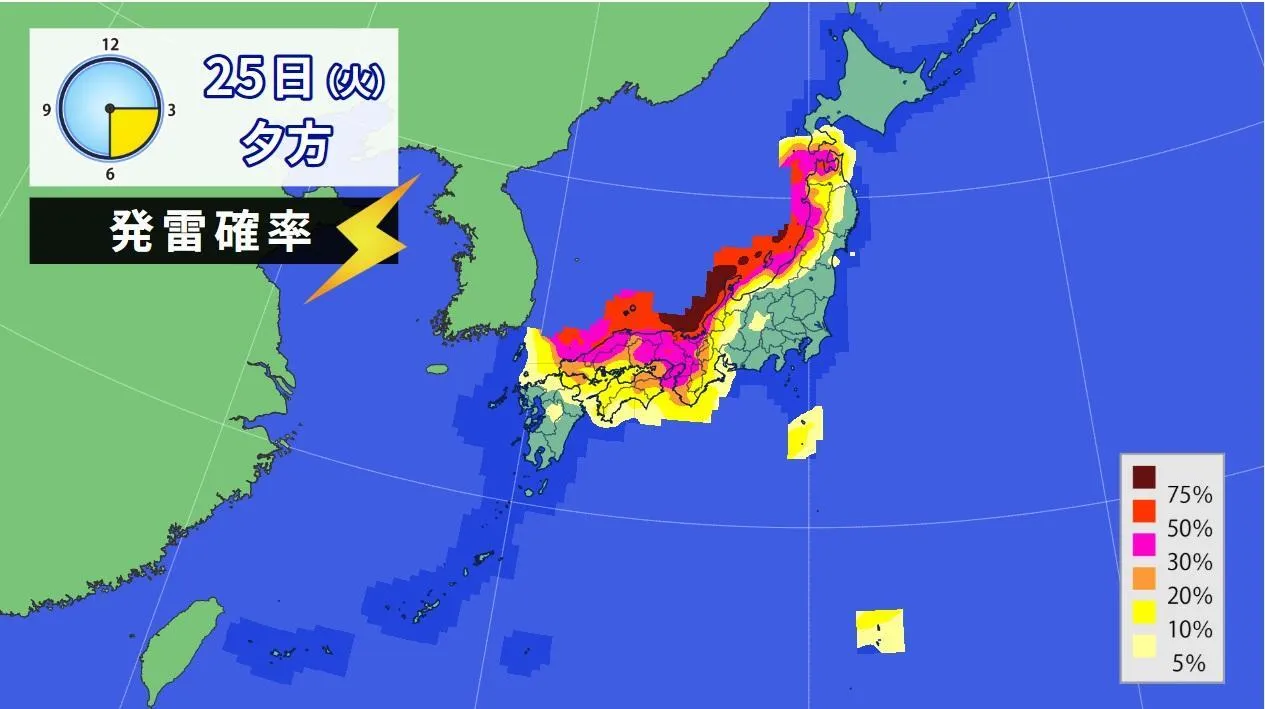 Các đám mây tích điện sẽ phát triển mạnh, đặc biệt ở các vùng ven Biển Nhật Bản, với xác suất sấm sét vượt quá 50%. Vì vậy, hãy chú ý đến sét đánh, gió giật mạnh như lốc xoáy và mưa lớn đột ngột (Hình 2).