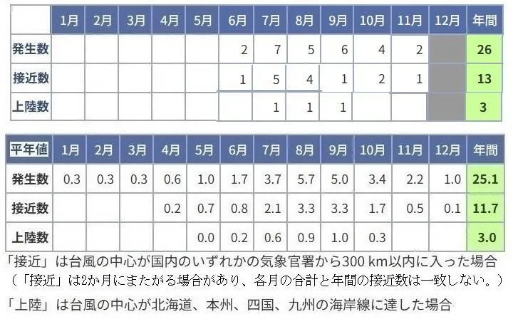 Bảng: Số lượng bão hình thành, số lượng bão tiếp cận và số lượng bão đổ bộ theo tháng trong năm Reiwa thứ 7 (đến ngày 24 tháng 11 năm 2025) và mức trung bình hàng năm (dưới)