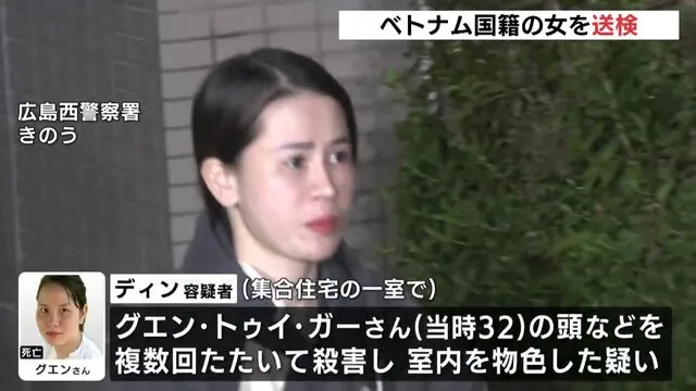 Cảnh sát tỉnh Hiroshima đã bắt giữ Đinh Thị Phong (32 tuổi), một nữ thực tập sinh người Việt Nam, với cáo buộc giết hại đồng hương Nguyễn Thúy G. (32 tuổi) tại một căn hộ ở thành phố Hiroshima. Vụ án gây chấn động dư luận, đặc biệt trong cộng đồng người Việt tại Nhật Bản.