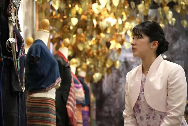Công chúa Aiko, trưởng nữ của Thiên hoàng và Hoàng hậu, xem các trang phục dân tộc được trưng bày tại Lao Silk Residence. Ảnh chụp lúc 11 giờ 9 phút sáng ngày 21 tháng 11 năm 2025 tại Vientiane, Lào, bởi Ikushima Kentaro.