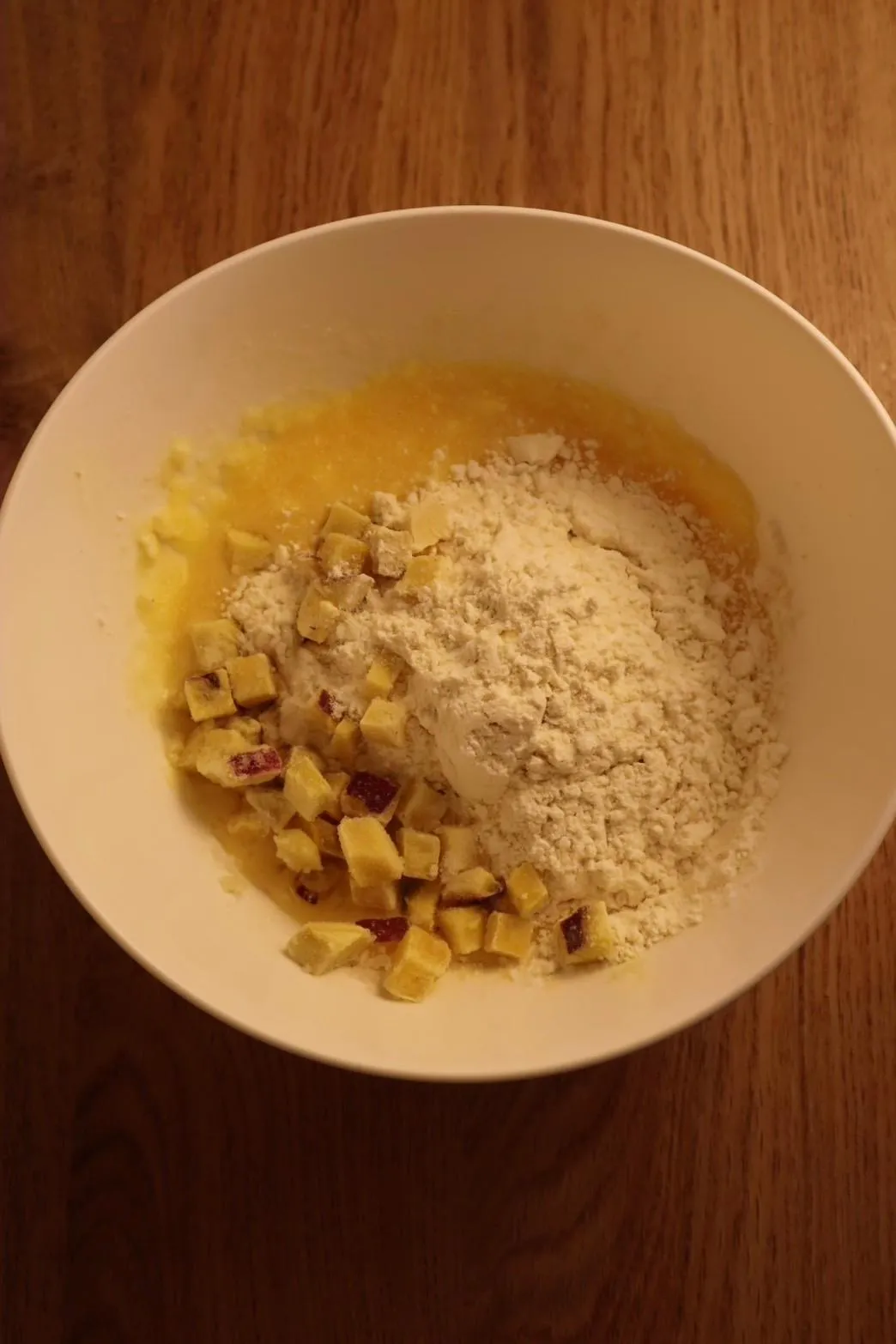 Thêm khoai lang cắt hạt lựu đông lạnh và bột làm bánh pancake, trộn cho đến khi hỗn hợp mịn.