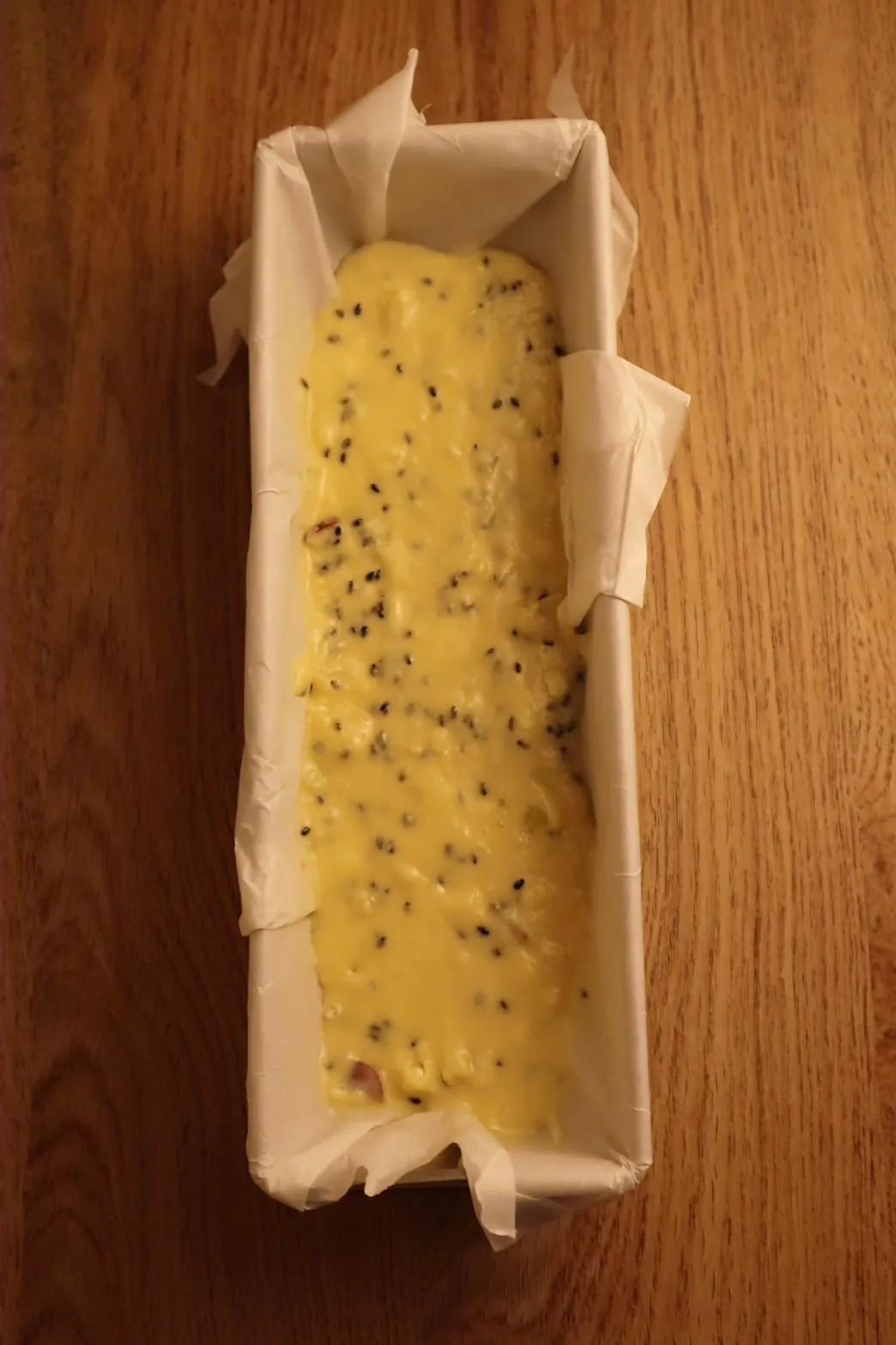 Đổ hỗn hợp vào khuôn bánh bông lan đã lót giấy nến, nướng trong lò đã làm nóng trước ở 170 độ C khoảng 35-40 phút.