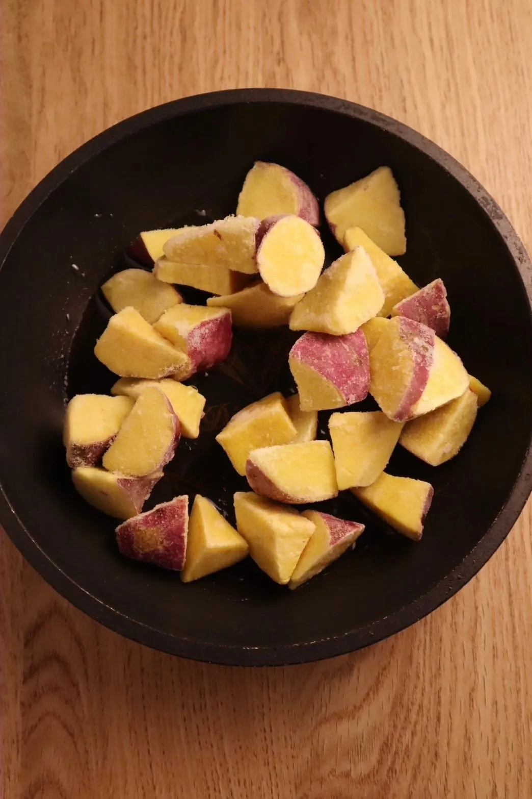 Cho khoảng 5mm dầu ăn vào chảo, sau đó cho khoai lang cắt khúc đông lạnh vào chiên vàng đều ở lửa vừa (khoảng 10-12 phút).