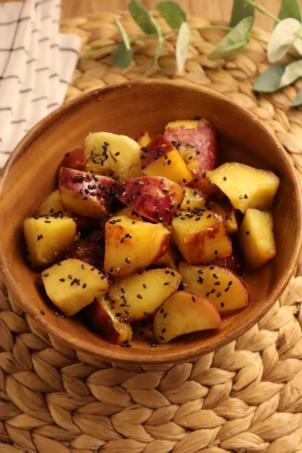 Hương thơm của mè đen tạo điểm nhấn, làm nổi bật vị ngọt mộc mạc của khoai lang.