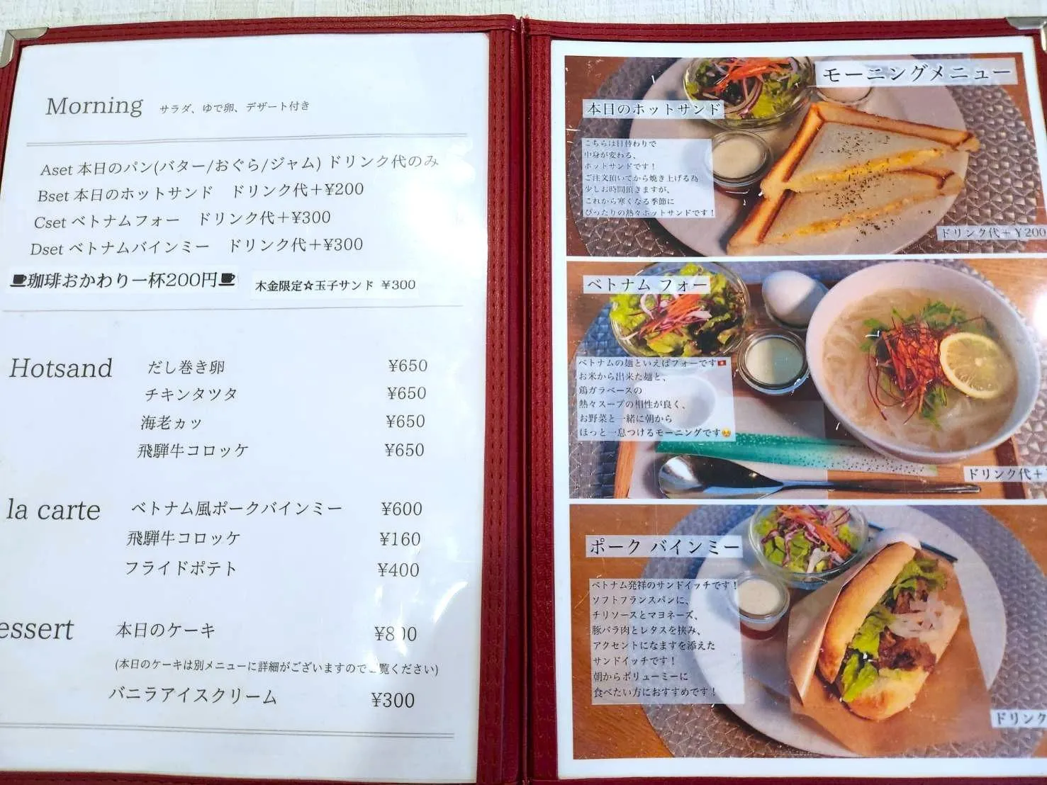 Đây là một phần thực đơn. Bữa sáng có các món như bánh mì của ngày, sandwich nóng của ngày, phở Việt Nam và bánh mì Việt Nam.