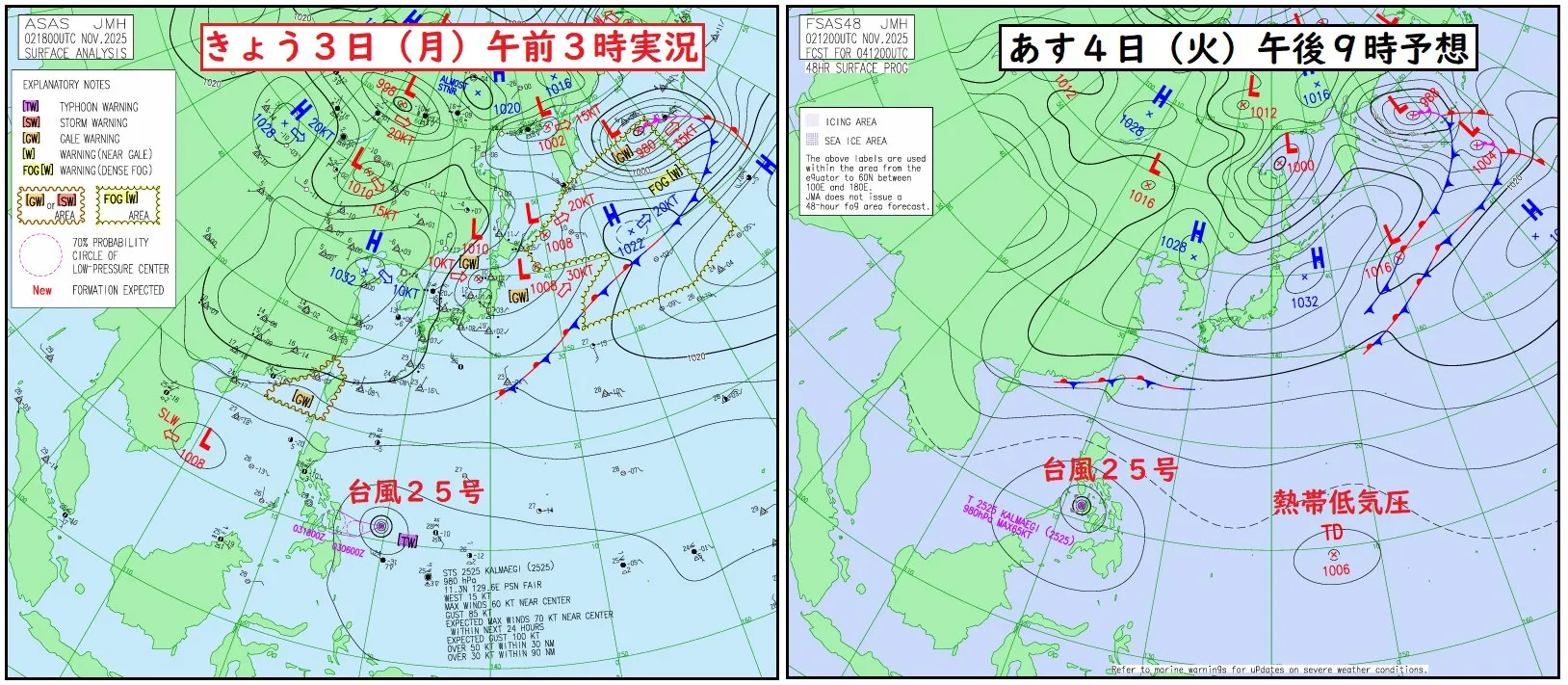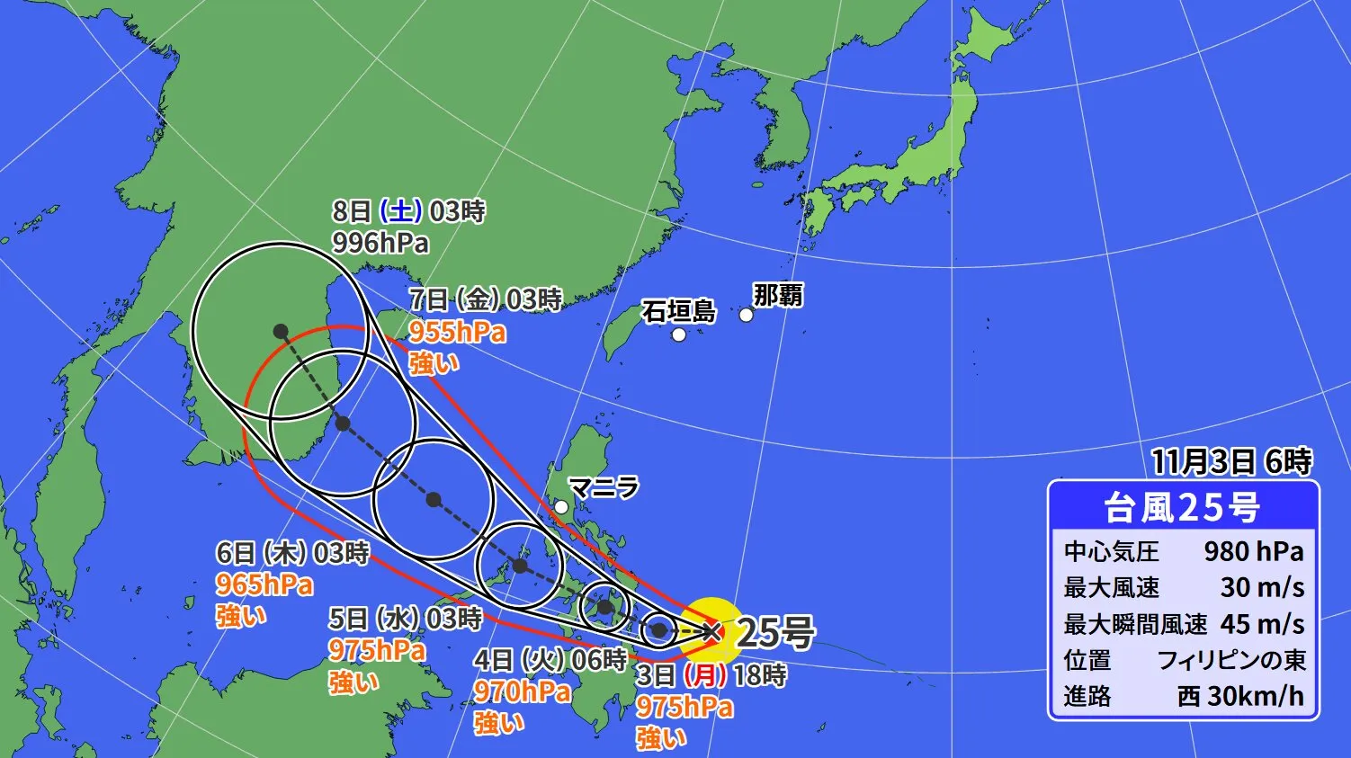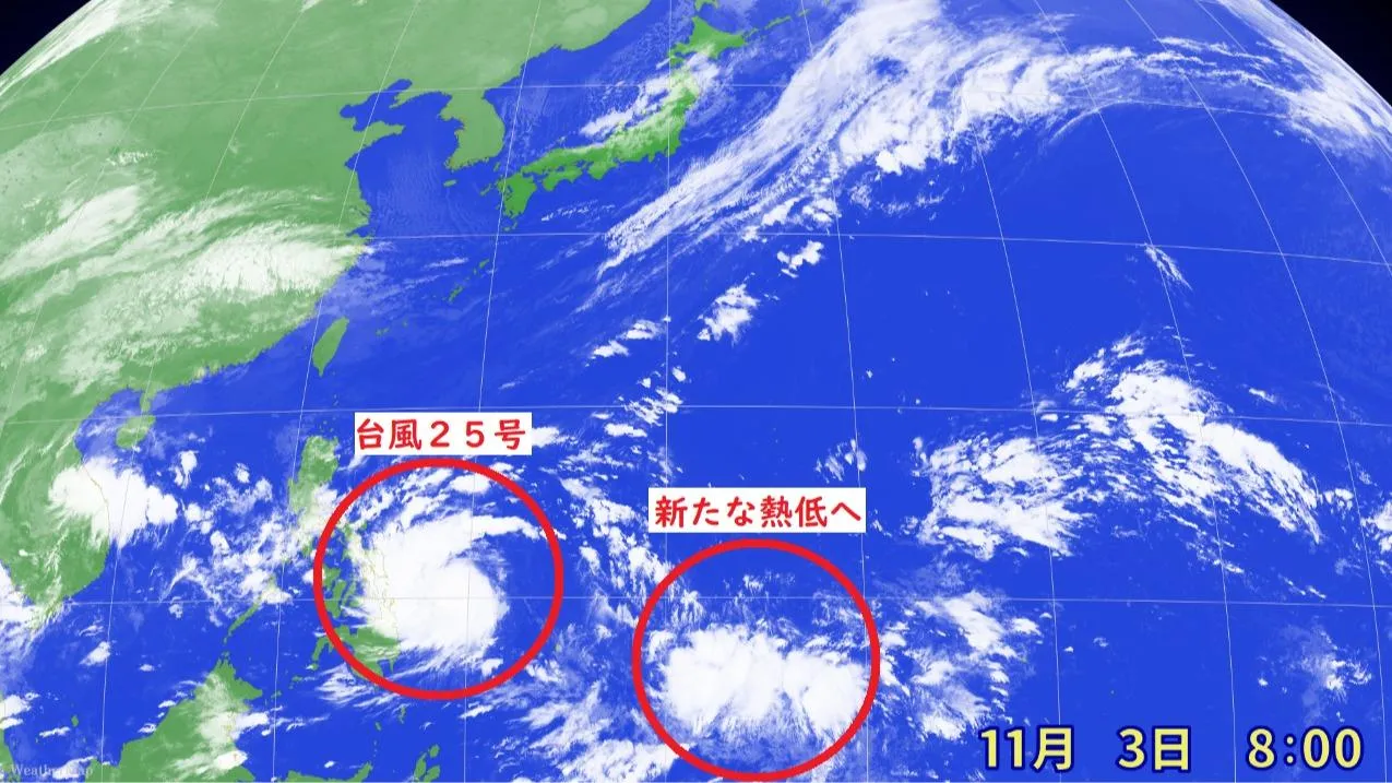Bão số 25, hình thành lúc 21:00 ngày 1 tháng 11, đang mạnh dần và di chuyển theo hướng Tây. Sau khi đi qua Philippines vào ngày 4 tháng 11, bão dự kiến sẽ hướng về Biển Đông và Việt Nam, được xem là lộ trình "chuẩn" của các cơn bão tháng 11. Mặc dù không ảnh hưởng trực tiếp đến khu vực Nhật Bản, nhưng các khu vực nằm trên đường đi của bão có thể phải đối mặt với ảnh hưởng và thiệt hại. Đặc biệt, năm nay có rất nhiều cơn bão hướng về phía Việt Nam.