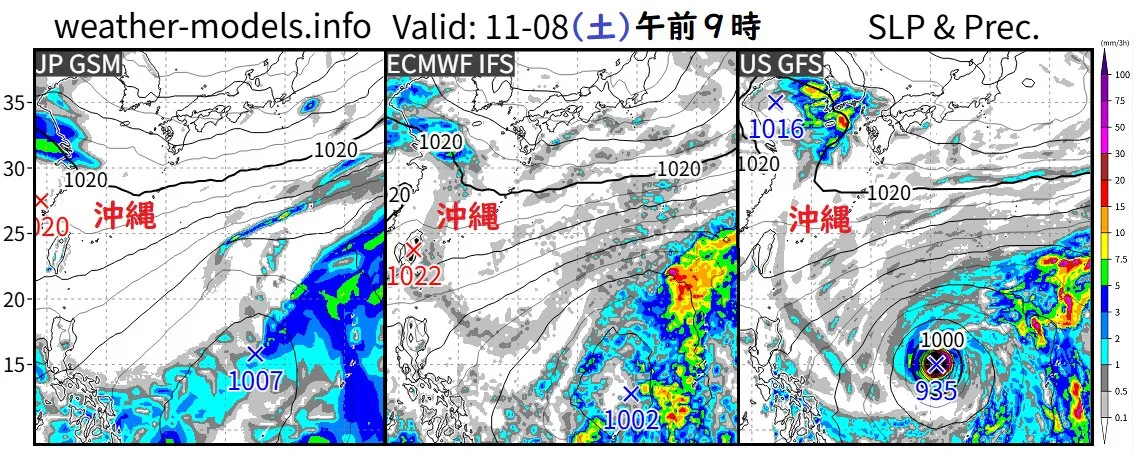 Để tham khảo, hình trên là kết quả tính toán lúc 09:00 ngày 8 tháng 11 của mô hình GSM (Nhật Bản), mô hình ECMWF (Trung tâm Dự báo Thời tiết Trung hạn Châu Âu) và mô hình GFS (Mỹ). Mô hình GSM và ECMWF dự báo bão không phát triển mạnh và di chuyển về phía Tây xa về phía Nam Nhật Bản, trong khi mô hình GFS dự báo bão sẽ phát triển đáng kể và di chuyển về phía Tây. Cường độ và đường đi sau đó vẫn còn nhiều biến động và không chắc chắn.
