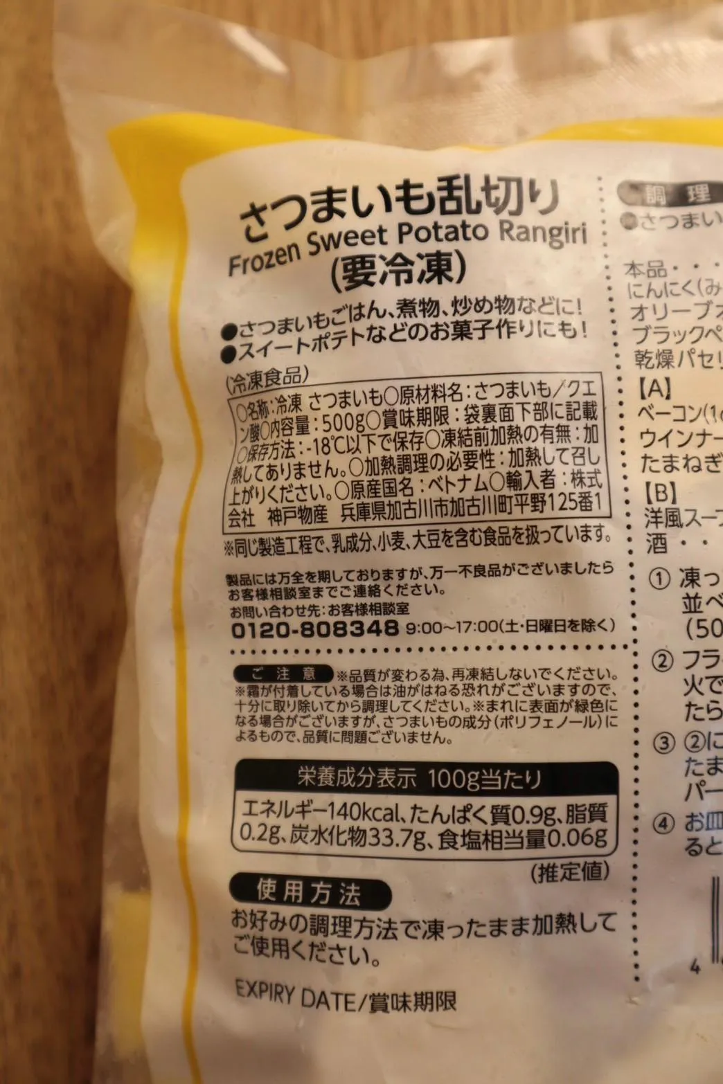 Giá: 313 yên (chưa thuế) Khối lượng tịnh: 500g Cách bảo quản: Dưới -18 độ C Xuất xứ: Việt Nam Nhà nhập khẩu: Công ty Kobe Bussan