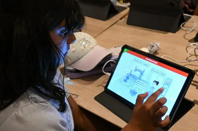 Em Kandel Swikrity, học sinh lớp 5, học tiếng Anh trên máy tính bảng = 14:18 ngày 3 tháng 8 năm 2025, tại 1-chome Yoshizuka, Hakata-ku, thành phố Fukuoka, ảnh của Kiriko Nemoto.