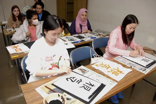 [Các học sinh quốc tế thử sức với thư pháp tại Trung tâm Huấn luyện Thanh thiếu niên thành phố, Wakayama-cho, Kameyama]