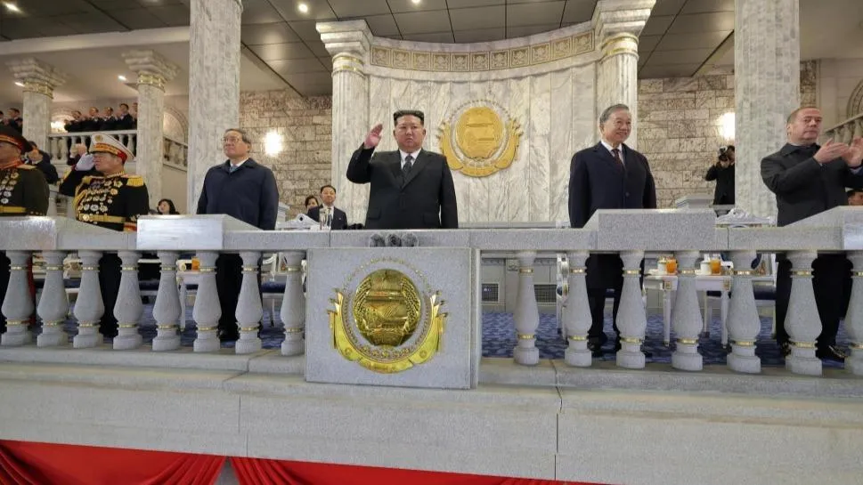 Tổng Bí thư Kim Jong Un (giữa) duyệt binh quân sự. (Từ trái sang) Thủ tướng Trung Quốc Lý Cường, (từ phải sang) Tổng Bí thư Đảng Cộng sản Việt Nam Tô Lâm, Phó Chủ tịch Hội đồng An ninh Nga Medvedev = Trích từ báo Rodong Sinmun ngày 11 tháng 10.