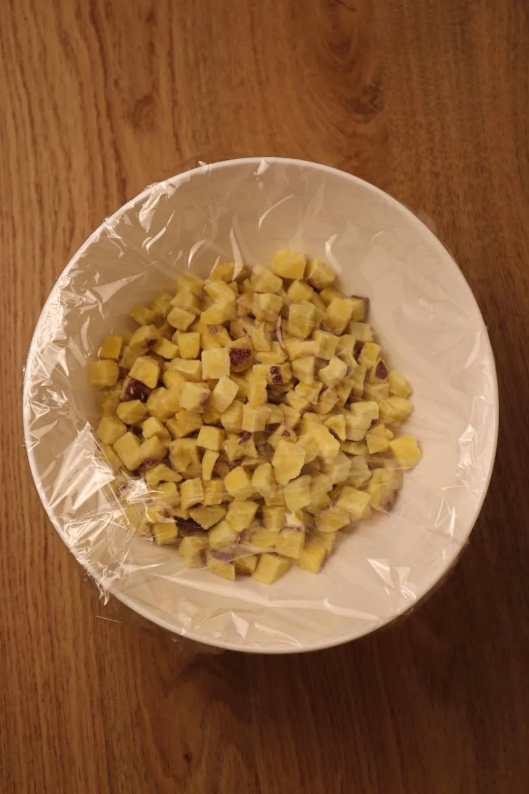 ① Cho khoai lang cắt hạt lựu vào tô chịu nhiệt, bọc màng bọc thực phẩm và quay lò vi sóng 600W trong 7 phút.