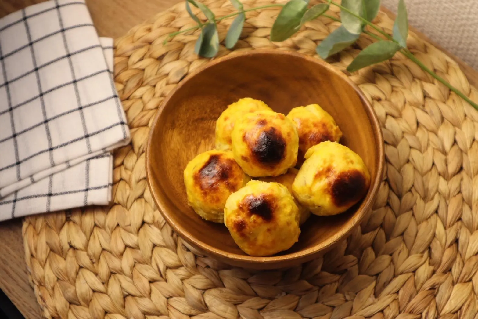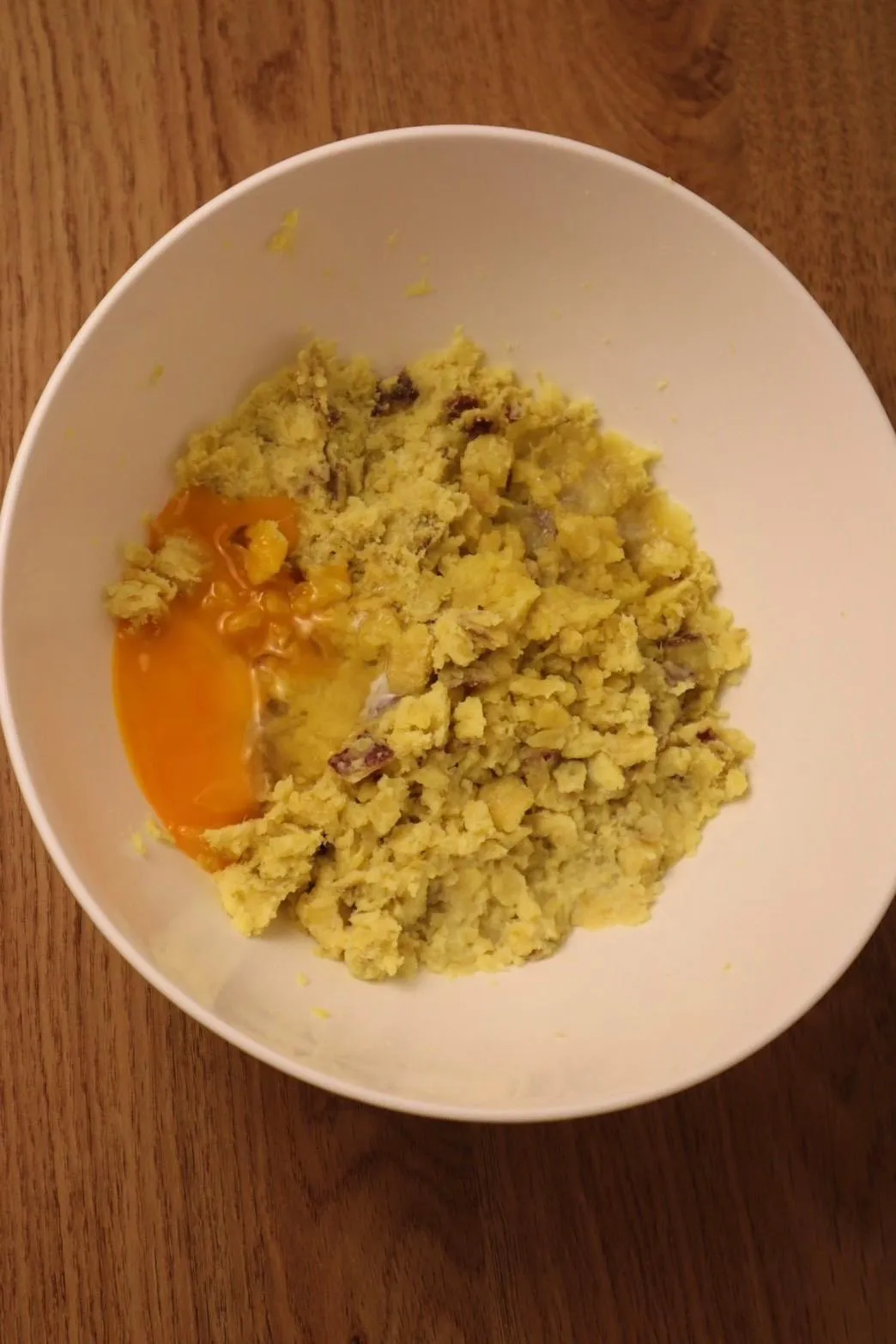 ⑤ Dùng cọ hoặc mặt sau muỗng quét một lớp mỏng lòng đỏ trứng lên bề mặt bánh khoai lang đã tạo hình.