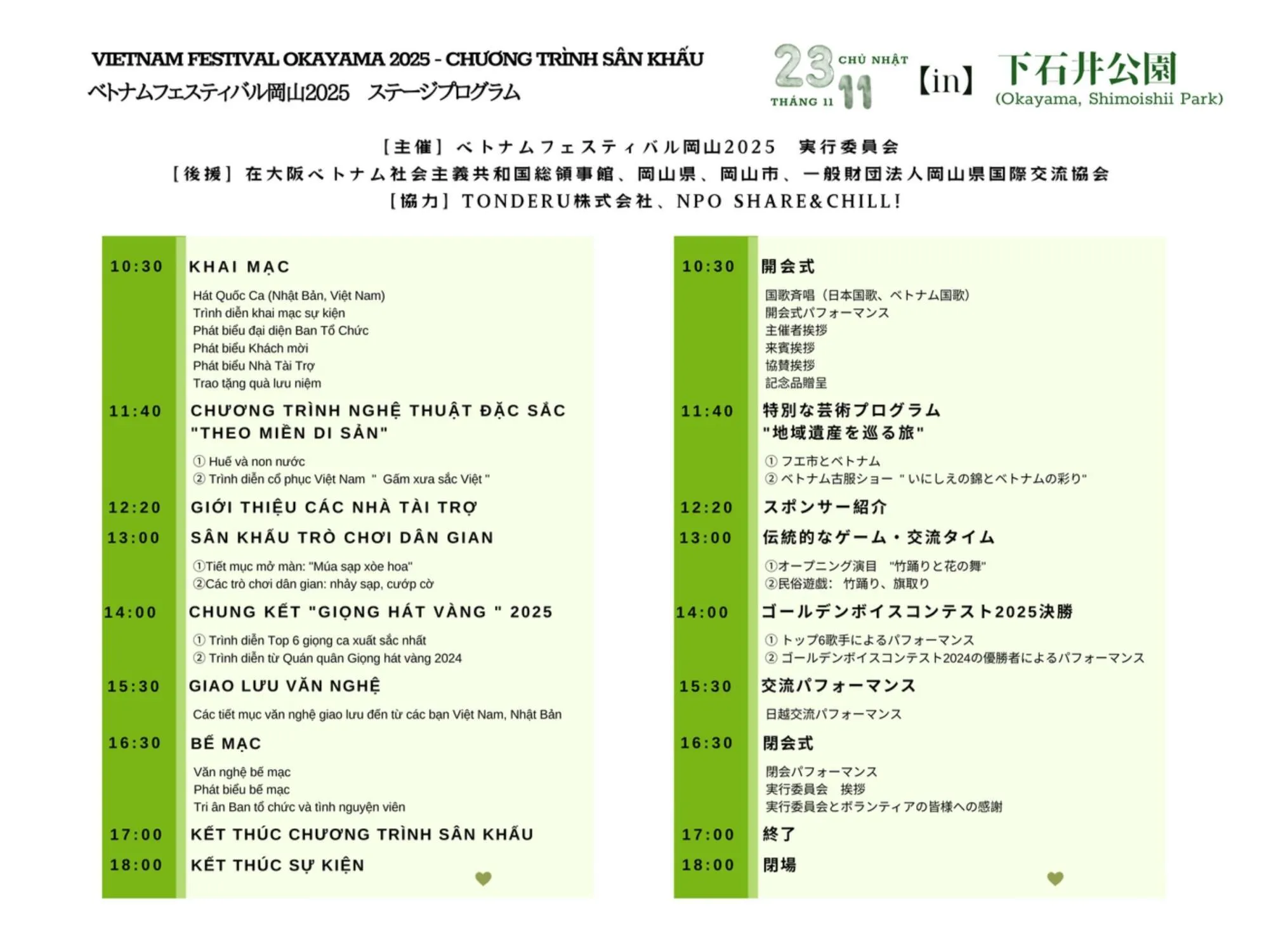 Lễ hội Việt Nam Okayama 2025 (VIETNAM FESTIVAL OKAYAMA 2025) sẽ được tổ chức tại Công viên Shimoishii, khu Sachi-cho, Kita-ku vào Chủ Nhật, ngày 23 tháng 11 năm 2025!