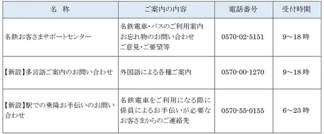 Với việc triển khai các dịch vụ trên, số điện thoại của từng ga sẽ dần ngừng công khai vào khoảng tháng 3 năm 2026. "Trung tâm Hỗ trợ Khách hàng Meitetsu" (0570-02-5151), nơi tiếp nhận các yêu cầu và hướng dẫn chung, sẽ tiếp tục hoạt động.