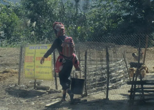 Trên thực địa. Một người mẹ trẻ dân tộc Thái Đen cõng con, mang phân bón ra đồng (Ảnh: Kashiwagi Masao)
