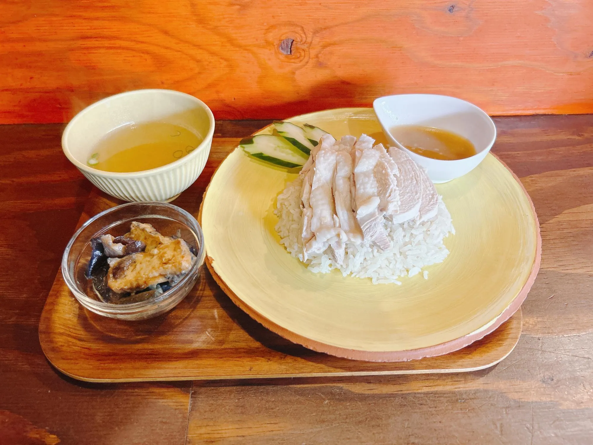 "Khao Man Gai Teishoku" 1.220 yên (đã bao gồm thuế) Lần này, tôi đã gọi món Khao Man Gai Teishoku, một món ăn Thái phổ biến. Cơm nhài được nấu với nước dùng gà, bên trên là nhiều thịt gà hấp mềm mọng.