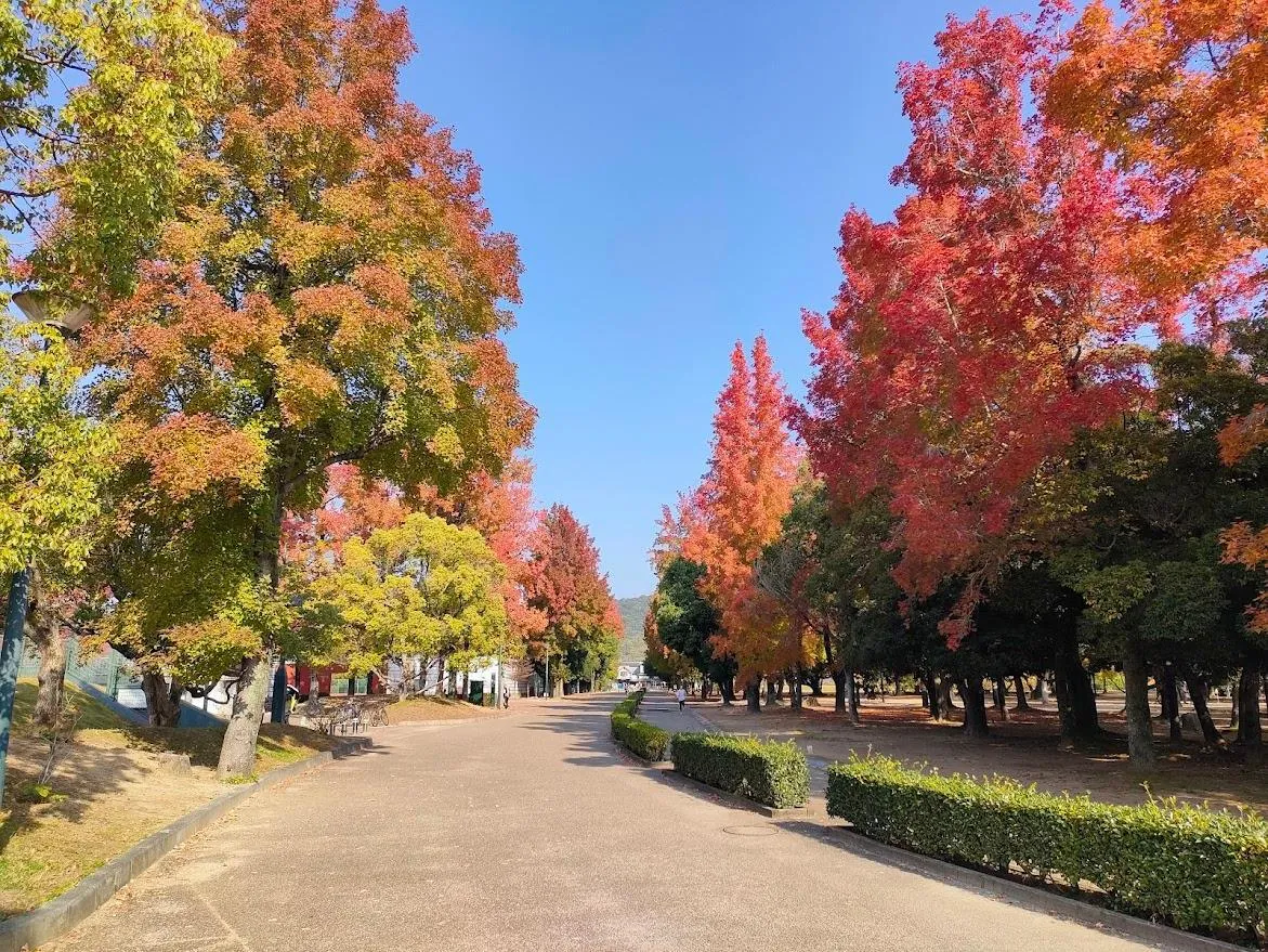 Tại "Công viên Tổng hợp Okayama" ở khu vực Kita, thành phố Okayama, cây cối trong công viên đã chuyển sang màu đỏ và vàng rực rỡ, tạo nên khung cảnh mùa thu tuyệt đẹp. Trên khuôn viên rộng lớn này có nhiều điểm ngắm lá đỏ khi tản bộ, bạn có thể thong thả tận hưởng cảnh quan đầy màu sắc theo mùa. Có nhiều điểm chụp ảnh đẹp, rất lý tưởng cho chuyến đi chơi mùa thu. (Ngày chụp: 14 tháng 11 năm 2025)