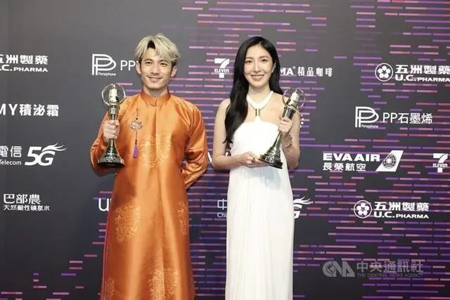 Liên Bỉnh Phát (trái), người gốc Việt, đoạt giải Nam diễn viên chính xuất sắc nhất hạng mục phim truyền hình dài tập, và Sheryl Yang (Dương Cẩn Hoa), đoạt giải Nữ diễn viên chính xuất sắc nhất, tại Giải Kim Chung lần thứ 60 (hạng mục phim truyền hình) – Ảnh chụp ngày 18 tháng 10 năm 2025 bởi phóng viên của Central News Agency, Ông Duệ Khôn.