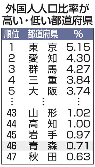 Số lượng người nước ngoài sống tại tỉnh Aomori là 8.415 người (tính đến cuối tháng 6), chiếm 0,71% dân số tỉnh. Tỷ lệ này thấp thứ hai trong số các tỉnh, thành phố của Nhật Bản, chỉ sau tỉnh Akita (0,63%). Về lý do Aomori có ít người nước ngoài, Phó Giáo sư Nguyễn Thị Nghĩa (người Việt Nam), đến từ Khoa Nghiên cứu Kinh tế của Đại học Tohoku (nghiên cứu viên thỉnh giảng tại Đại học Aomori Chuo Gakuin), cho rằng điều này bị ảnh hưởng bởi quy mô doanh nghiệp và cơ cấu công nghiệp là nơi tiếp nhận lao động.
