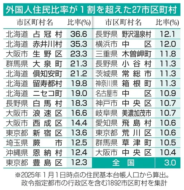 Tỷ lệ người nước ngoài được tính toán dựa trên sổ đăng ký cơ bản dân cư vào đầu năm nay. Tổng cộng 1.892 khu vực được thống kê, bao gồm 1.741 đơn vị hành chính tự trị và các quận hành chính của các thành phố được chỉ định bởi sắc lệnh chính phủ. Tỷ lệ cao nhất là làng Shimukappu ở Hokkaido, với 582 trên 1.590 cư dân (36,6%). Tiếp theo là làng Akaigawa (Hokkaido), quận Ikuno (thành phố Osaka), thị trấn Oizumi (tỉnh Gunma), thị trấn Kutchan (Hokkaido), với 5 quận/thị trấn/làng vượt quá 20%. Trong số 27 thành phố/thị trấn/làng có tỷ lệ hơn 10%, bao gồm làng Onna (tỉnh Okinawa), cũng có những khu vực đã có nhiều người định cư vĩnh viễn từ lâu.