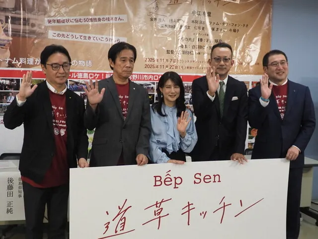 Sau buổi họp báo, diễn viên chính Nakae Yuri (giữa) và đạo diễn Shiroha Hiroyuki (thứ hai từ phải) chụp ảnh cùng Thống đốc tỉnh Tokushima Gotoda Masazumi (ngoài cùng bên trái) và những người khác. Ngoài cùng bên phải là Thị trưởng thành phố Yoshinogawa, Harai Kei. Thứ hai từ trái là Thị trưởng thị trấn Itano, Higashine Hiroyuki = tại Tòa thị chính tỉnh Tokushima, 1 Bandaicho, thành phố Tokushima, vào 11:51 sáng ngày 7 tháng 11 năm 2025, ảnh của Uematsu Koichi.
