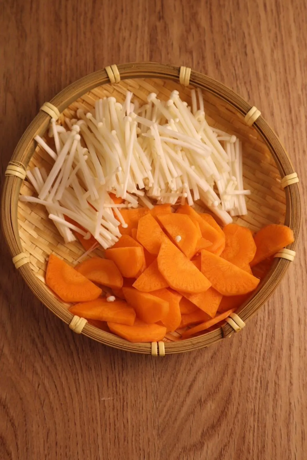 Cà rốt cắt lát bán nguyệt, nấm kim châm cắt đôi và tách ra.