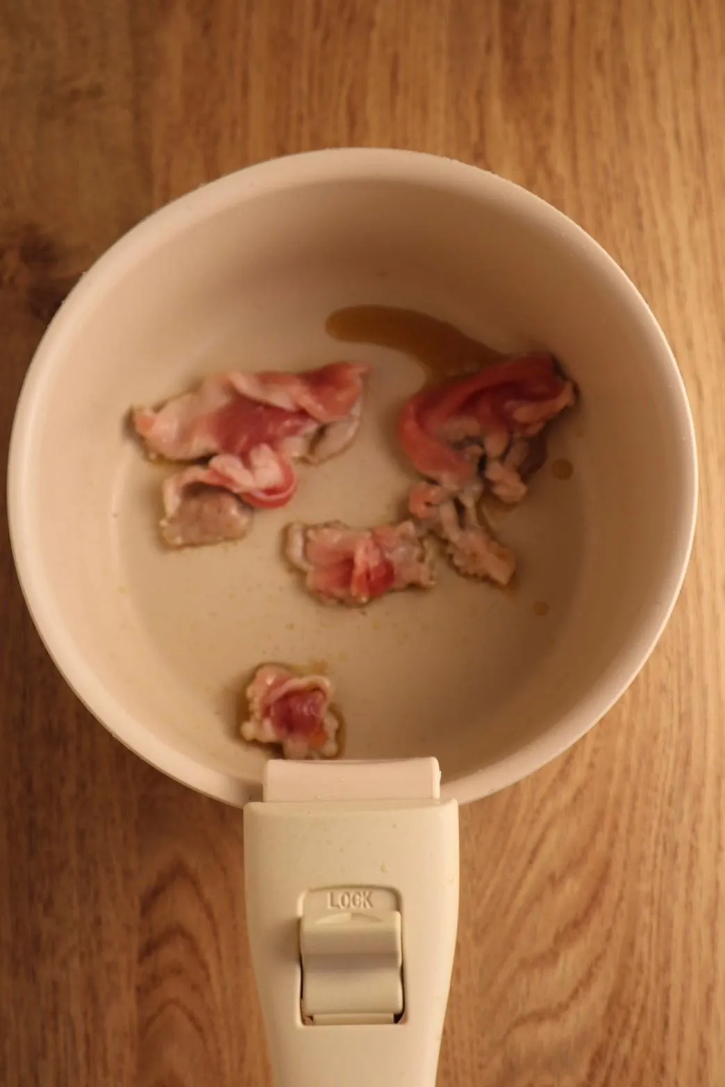 ① Đun nóng dầu mè trong nồi, cho thịt lợn ba chỉ thái nhỏ vào xào đến khi chín khoảng 8 phần.