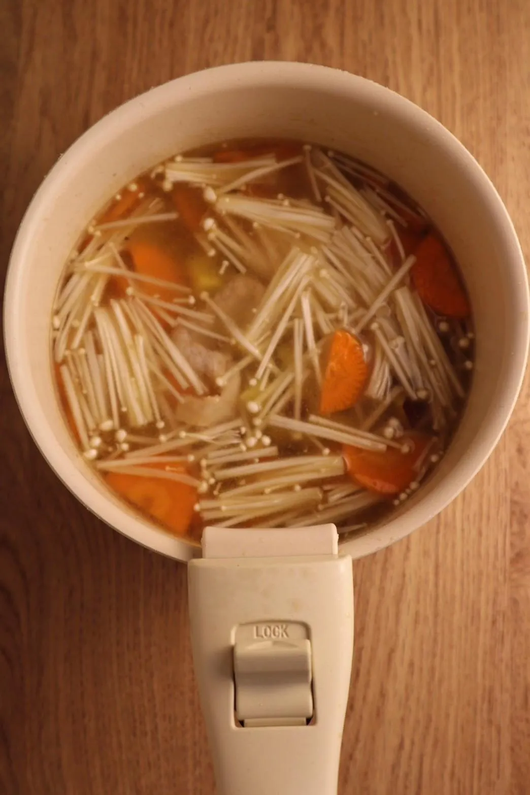 ② Thêm 【A】 vào, đun lửa vừa. Khi sôi, cho khoai lang đông lạnh, cà rốt và nấm kim châm vào.