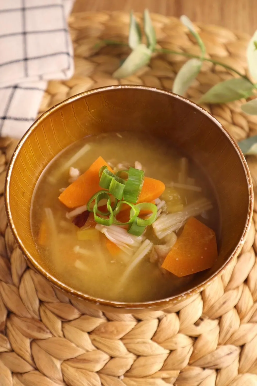 Vì có thể cho trực tiếp từ tủ đông vào mà không cần luộc sơ, rất tiện lợi! Khoai lang nguyên vỏ có độ bở và vị ngọt tự nhiên, rất hợp với vị umami của thịt lợn và vị đậm đà của miso. Với màu sắc của cà rốt và nấm kim châm, món canh trông càng ấm áp. Khi cho thêm chút gia vị dashi hạt sẽ làm nổi bật vị ngọt của khoai lang hơn. Món này cũng rất thích hợp cho bình giữ nhiệt đựng súp mang đi làm/học.