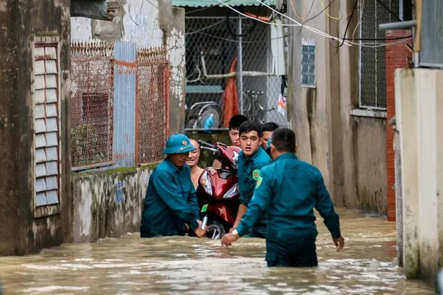 Người dân di chuyển xe máy khỏi khu vực ngập lụt tại tỉnh Nghệ An, miền Trung Việt Nam, ngày 30 tháng 9 năm 2025 = Reuters