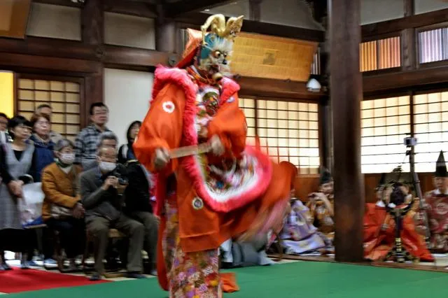 Vào ngày này, ông Matsuhisa đã trình diễn điệu múa solo. Ông xuất hiện với mặt nạ có hình rồng và trang phục màu đỏ tươi gợi nhớ sắc thu. Nửa đầu điệu múa nhẹ nhàng, nửa sau theo âm nhạc Gagaku với những nốt cao vang vọng, lặp đi lặp lại những động tác giống nhau theo tám hướng. Ông đã biểu diễn một điệu múa đầy sức sống, có lúc nhảy vọt, trong khoảng một giờ.