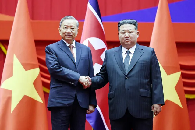 Ngày 9/10, tại Bình Nhưỡng, Tổng Bí thư Đảng Cộng sản Việt Nam Tô Lâm (trái) bắt tay Tổng Bí thư Đảng Lao động Triều Tiên Kim Jong Un (AFP-Jiji)