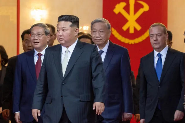 Cựu Tổng thống Nga Medvedev (phải), Thủ tướng Trung Quốc Lý Cường (trái), và Bí thư Đảng Cộng sản Việt Nam Tô Lâm tham dự Lễ kỷ niệm 80 năm thành lập Đảng Lao động Triều Tiên (ZUMA Press/Aflo).