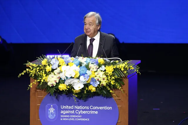 Tổng thư ký Liên Hợp Quốc Guterres phát biểu tại lễ ký kết hiệp ước chống tội phạm mạng được tổ chức tại thủ đô Hà Nội, Việt Nam vào ngày 25 (Ảnh: EPA Jiji).