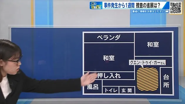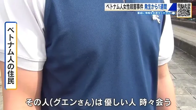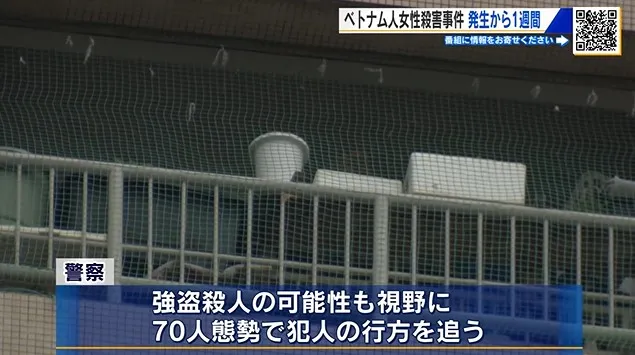 Sự việc một phụ nữ Việt Nam bị sát hại tại quận Nishi, thành phố Hiroshima, đã tròn một tuần vào ngày 22 tháng 10. Cảnh sát đã thành lập sở chỉ huy điều tra và đang tiếp tục điều tra, nhưng vẫn chưa bắt giữ được nghi phạm.