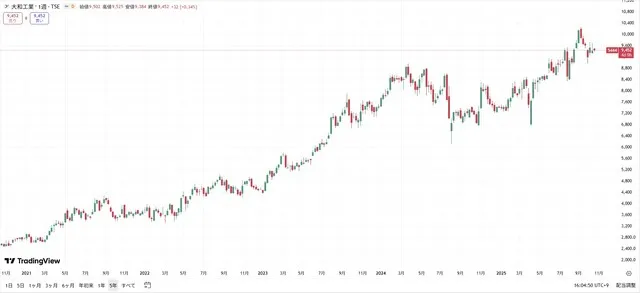 Cổ phiếu của nhà sản xuất thép Yamato Kogyo đang duy trì đà tăng trưởng ổn định. Dù có giai đoạn chững lại vào năm 2024 do sự sụt giảm mạnh của thị trường chứng khoán Nhật Bản vào tháng 8, nhưng nếu loại trừ giai đoạn đó, cổ phiếu này đã tăng trưởng đều đặn. Trong 5 năm gần đây, giá trị cổ phiếu đã tăng 3,7 lần. Mức tăng này vượt xa mức tăng 2,1 lần của chỉ số Nikkei 225 trong cùng kỳ.